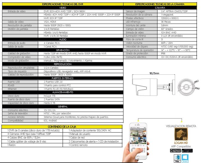 Kit DVR 8 Canales y 4 Camaras AHD